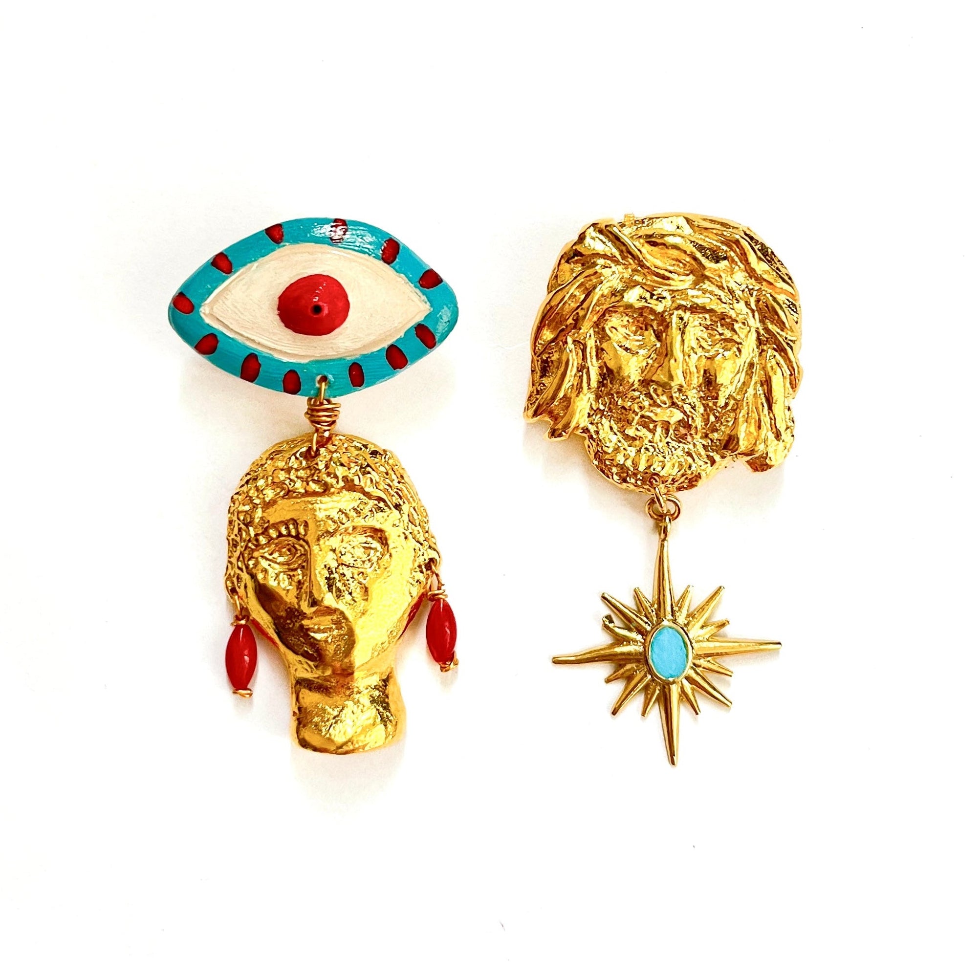 Amfitrite ve Poseidon figürleri altın kaplama pirinçtir. Her küpenin ağırlığı 17 gram, uzunluğu 6.5 cm’dir.