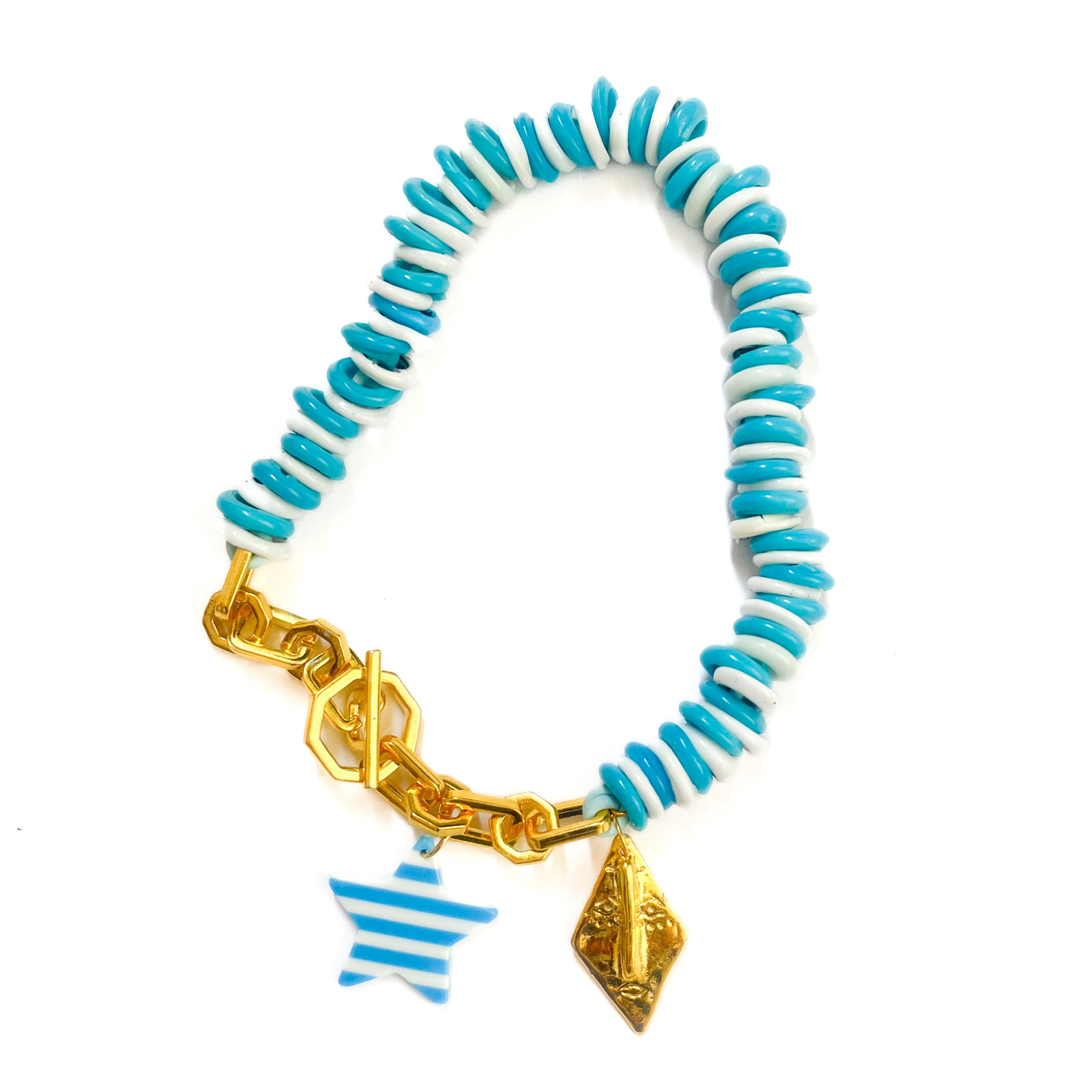 Unchain My Heart Star-Sailor Dude Kolyesi, altın kaplama pirinç bir Dude figürü ile el yapımı cam boncuklardan oluşur. Dude’un hemen yanında sallanan çizgili bir yıldız da var—kendi küçük pusulası gibi! Kolye uzunluğu 46 cm’dir, özel talep üzerine değiştirilebilir.