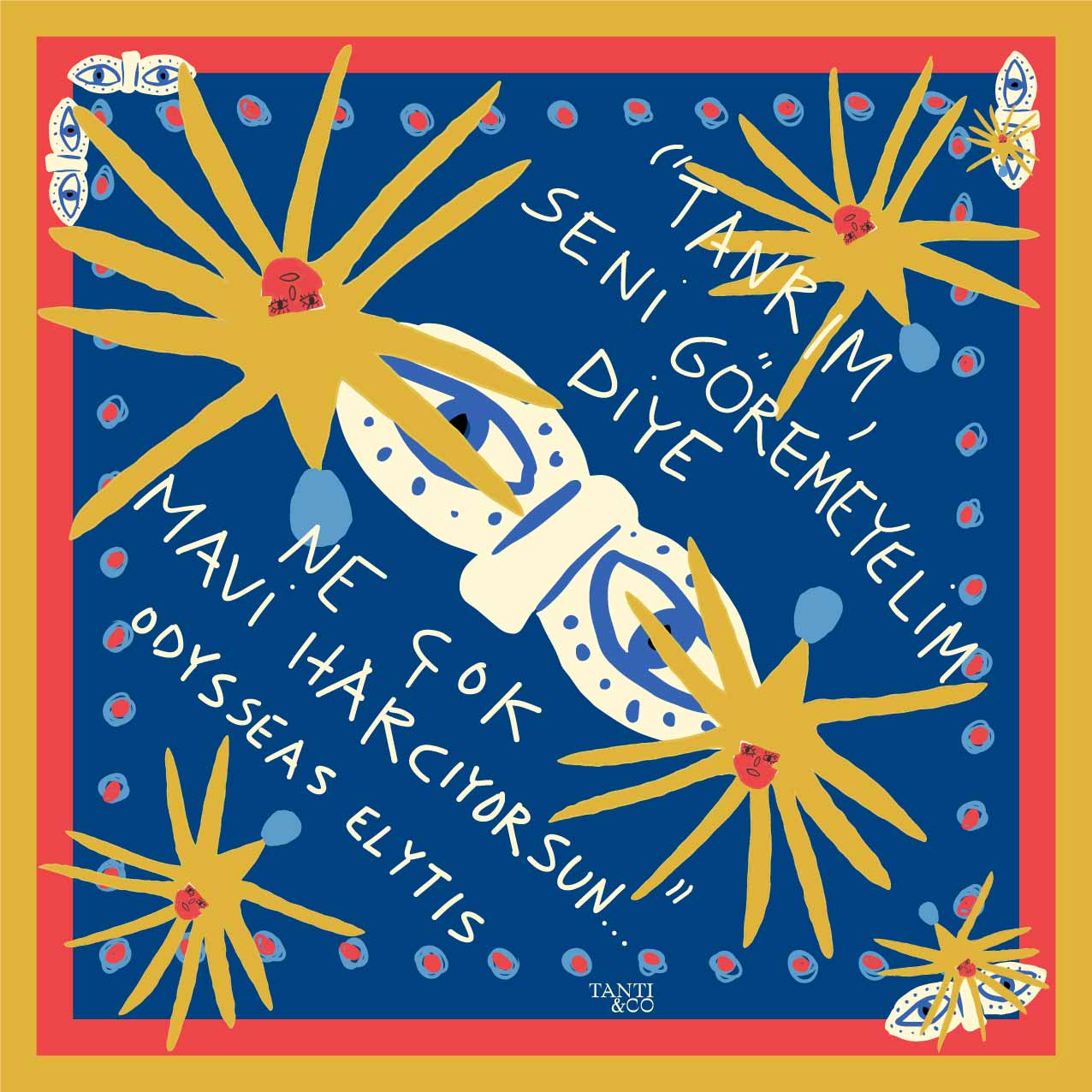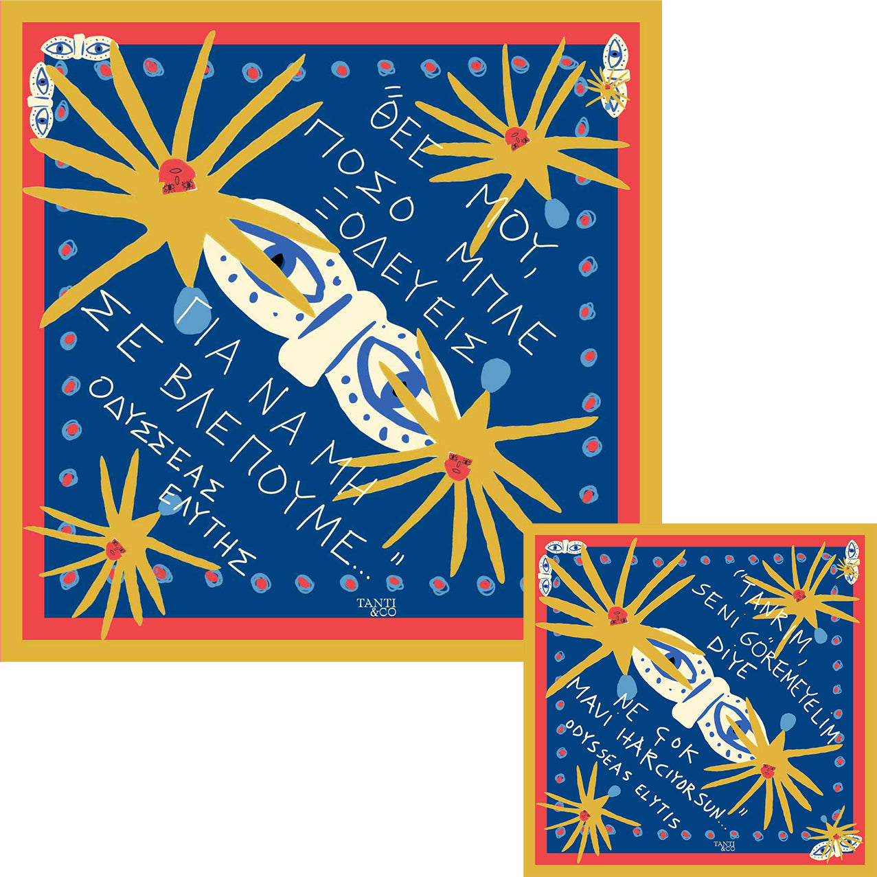 Big & Mini Blue seçeneğinde ise hikâye iki dil ve iki boyutta buluşur: Büyük eşarpta Yunanca, küçük eşarpta ise onun Türkçe karşılığı yer alır — biri akılla öğrenilen, diğeri kalple hissedilen.