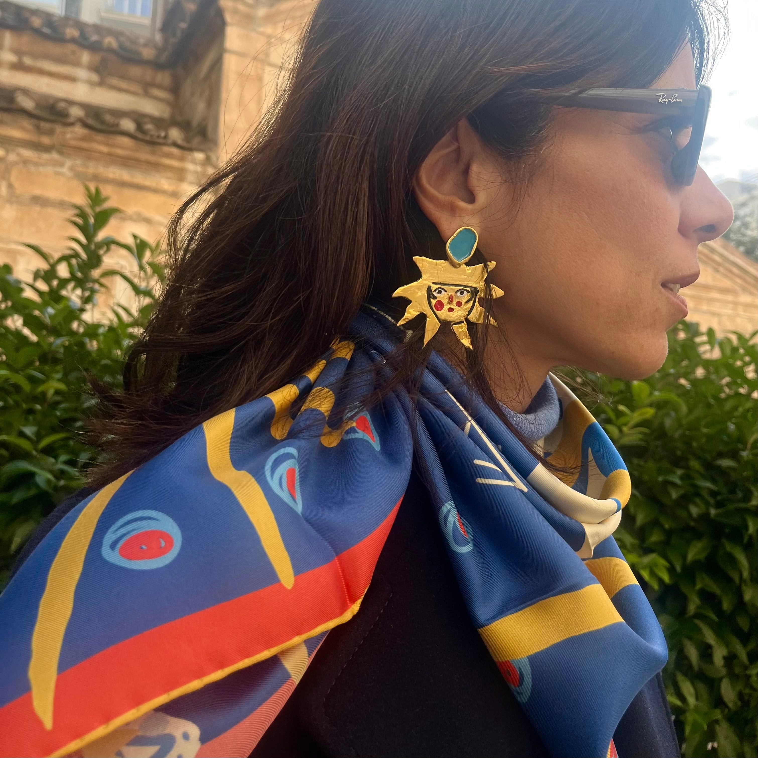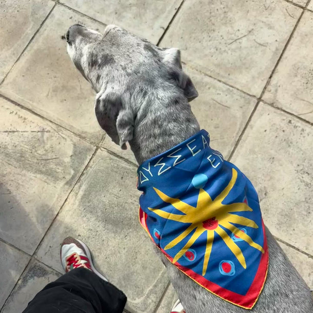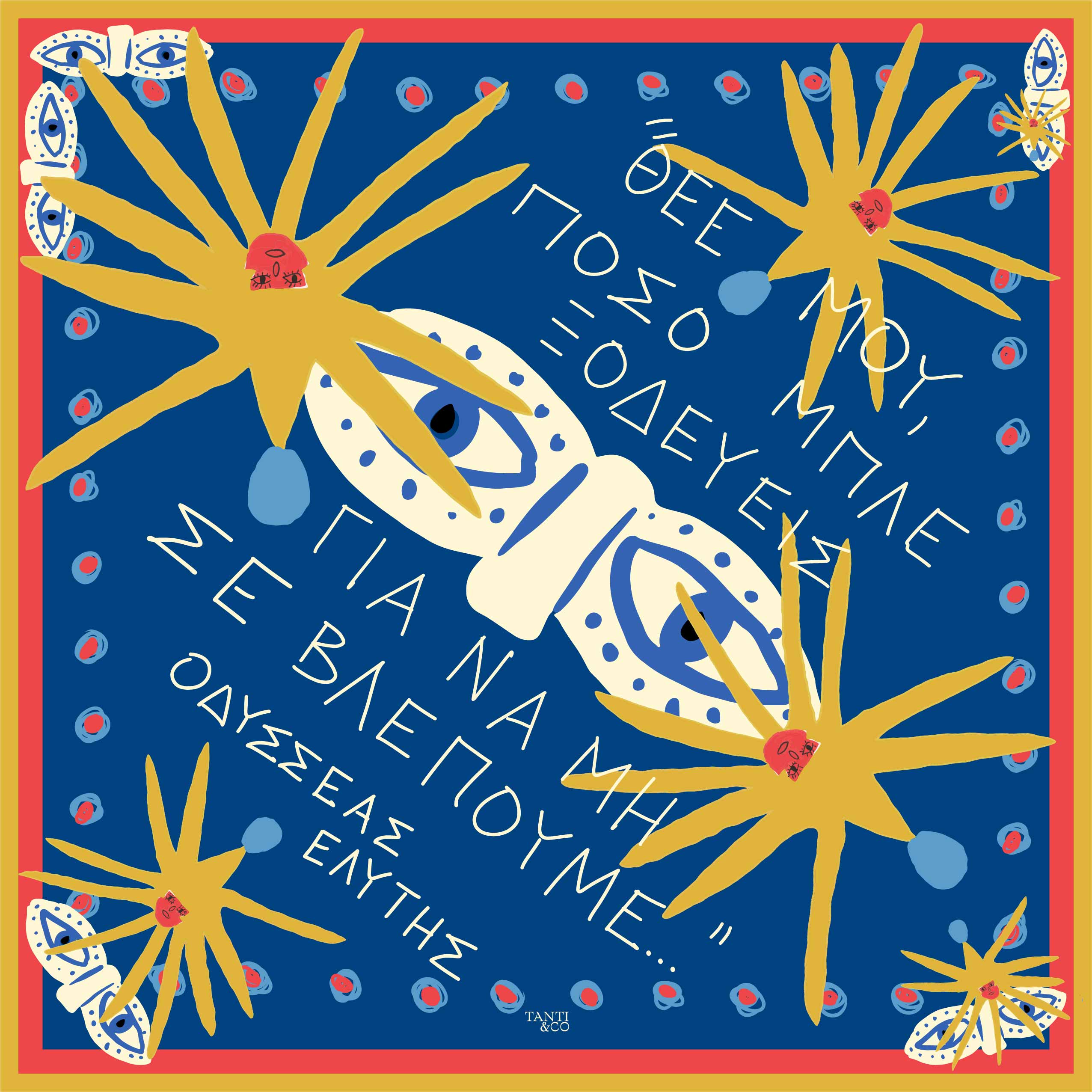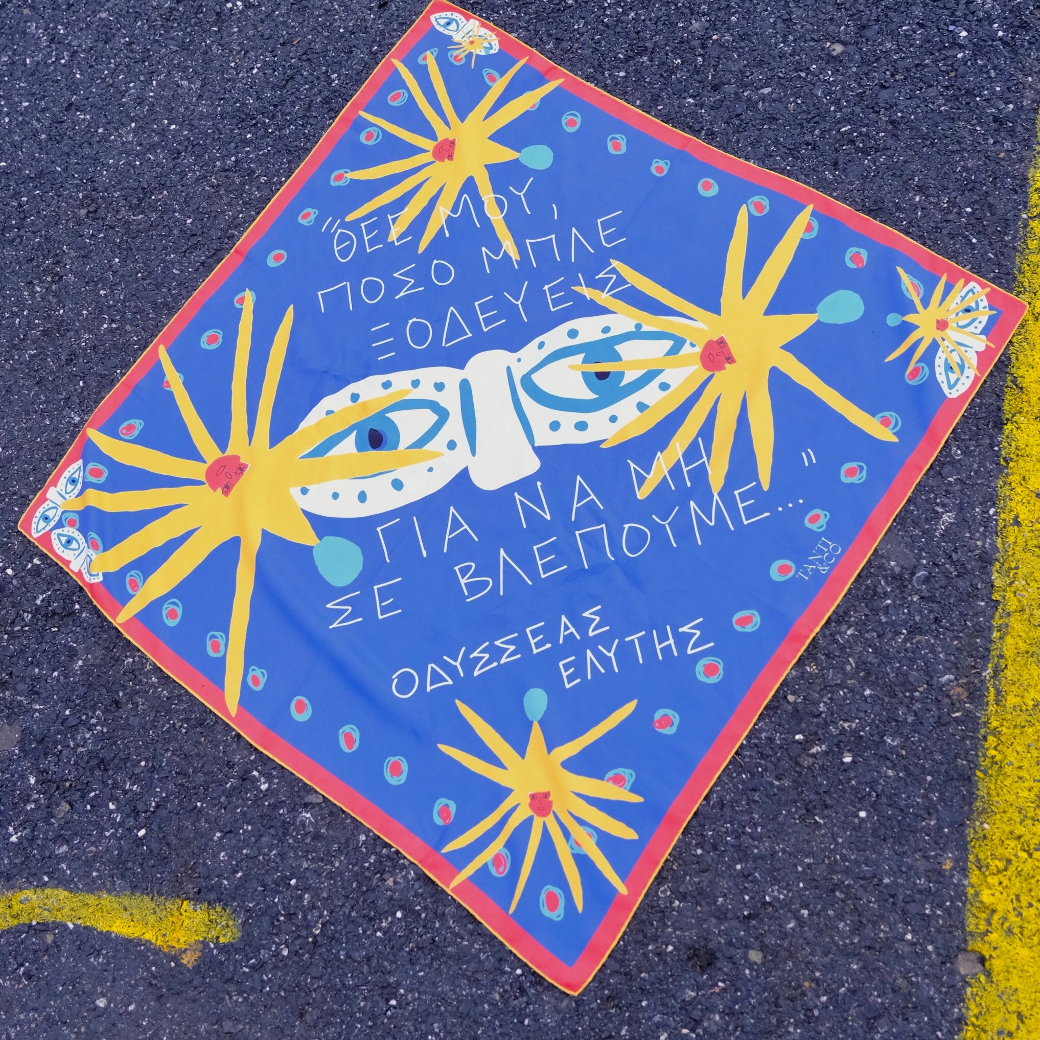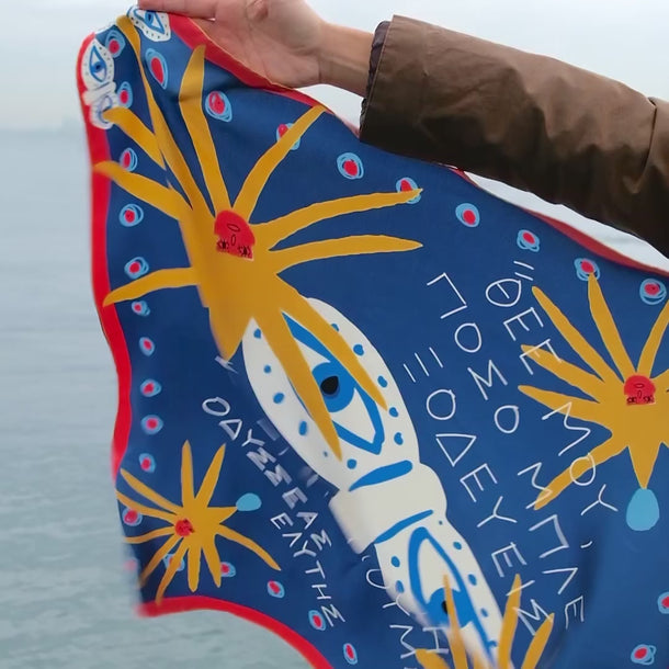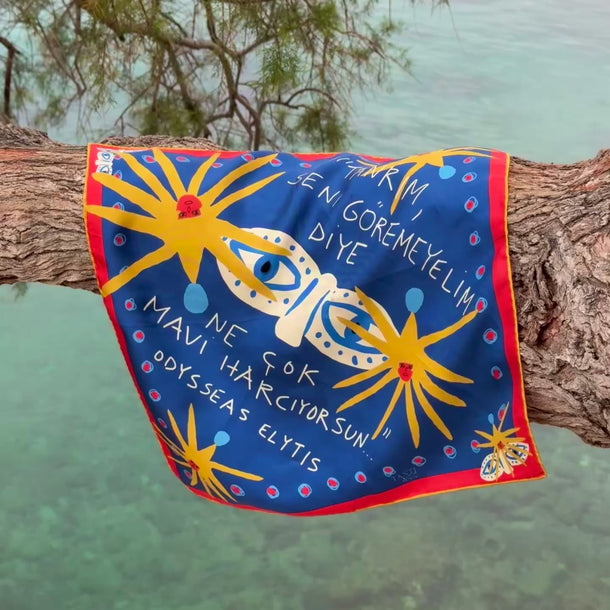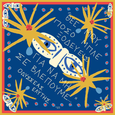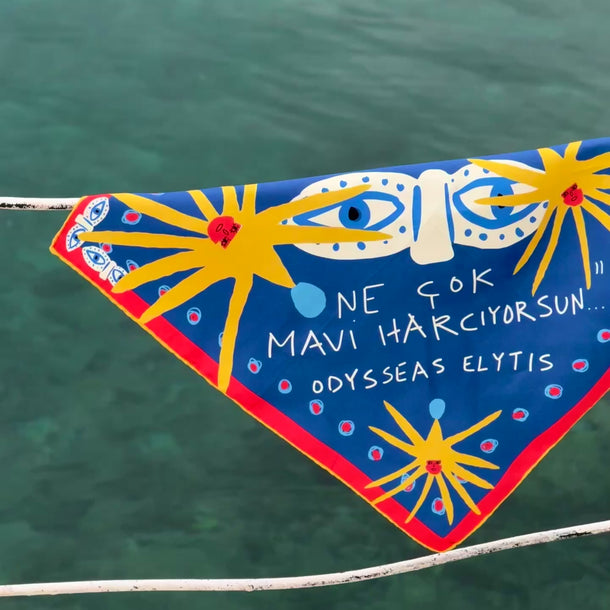 Mini Blue (45 × 45 cm) ise aynı Yunanca cümleyi daha küçük ve daha kişisel bir ölçekte taşır; gün boyu seninle olacak şekilde tasarlanmıştır — bandana olarak, bileğe ve boyna bağlanarak, çantaya dolanarak ya da çerçevelenip duvara asılabilir.