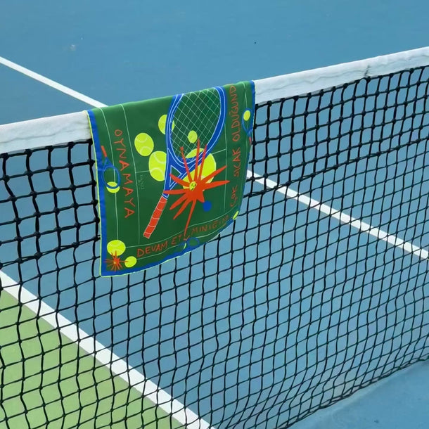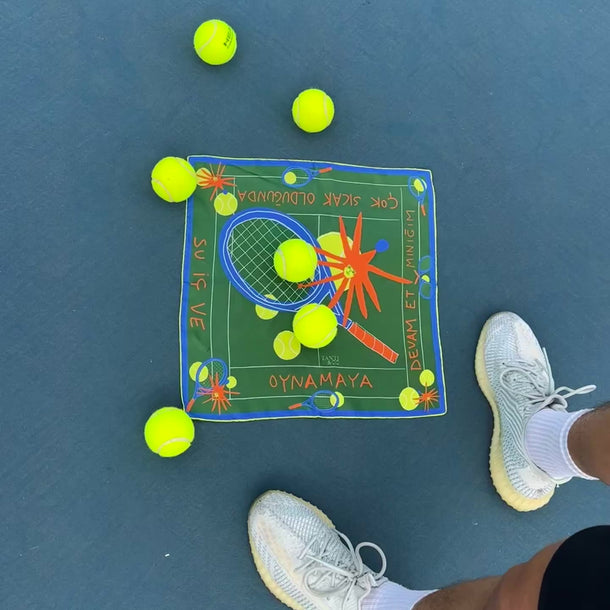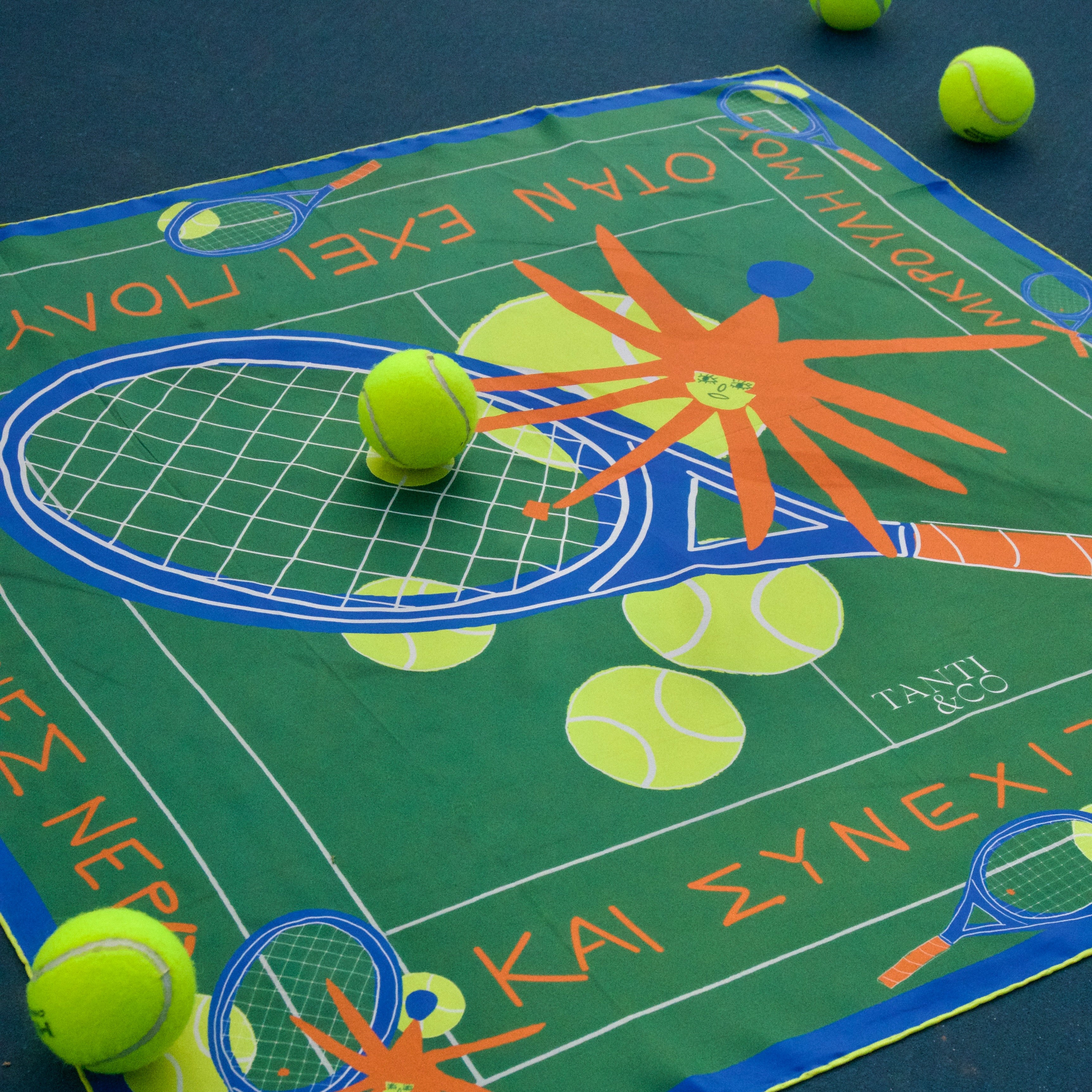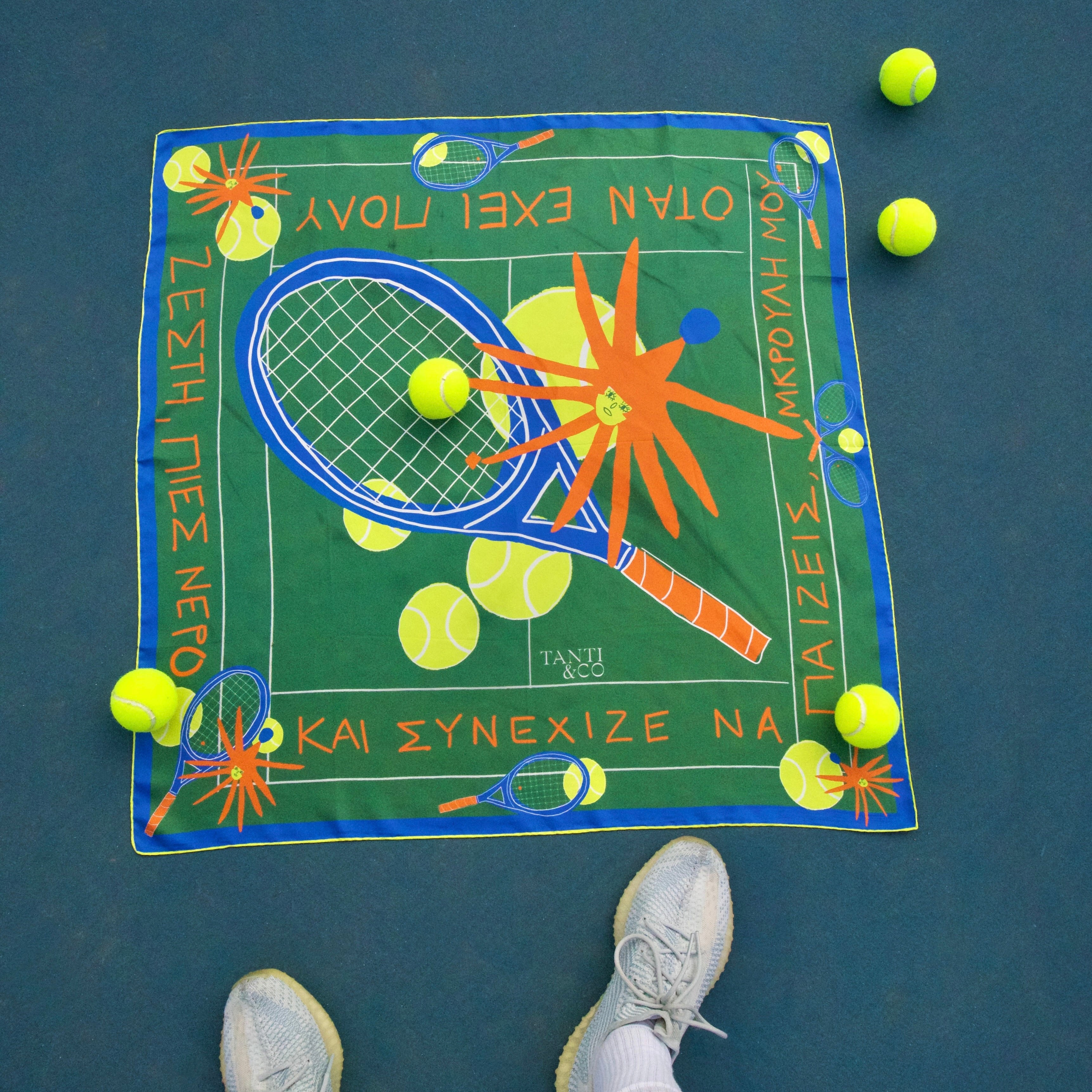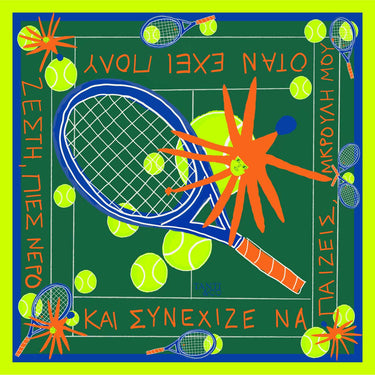 The Mini scarf (45 × 45 cm) offers the same Greek sentence in a smaller, more intimate size, meant to stay with you throughout the day — worn as a bandana, tied around the wrist or neck, wrapped around a bag, or framed as a small poetic artwork.