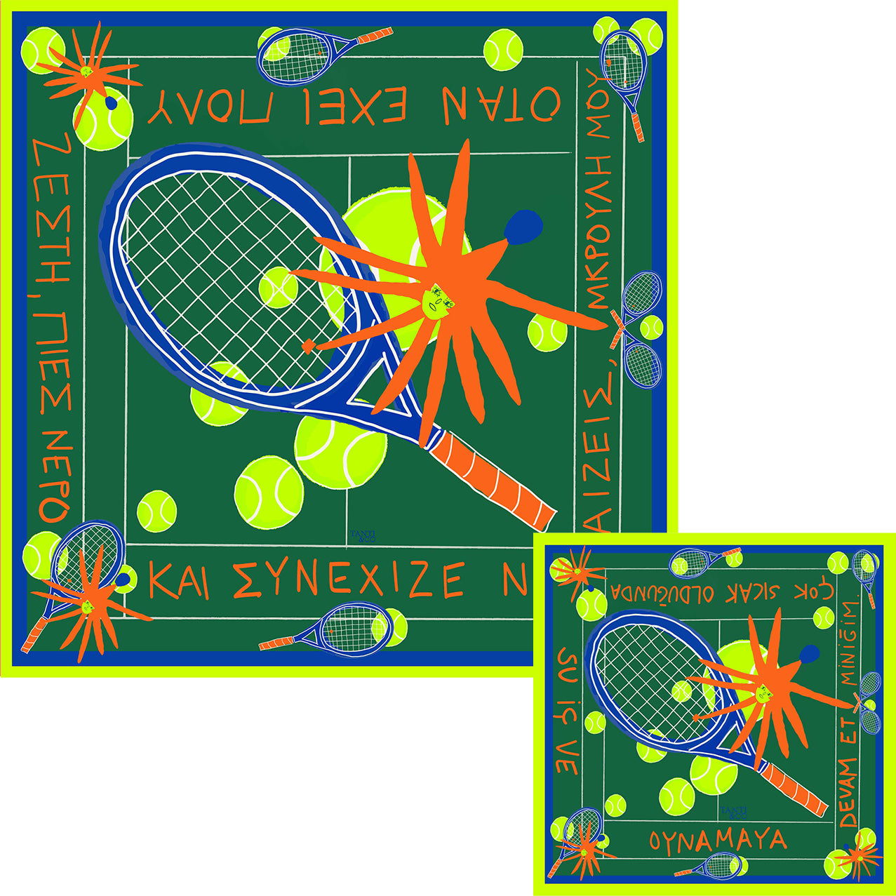 The Big scarf (90 × 90 cm) features the original Greek sentence in its full size.