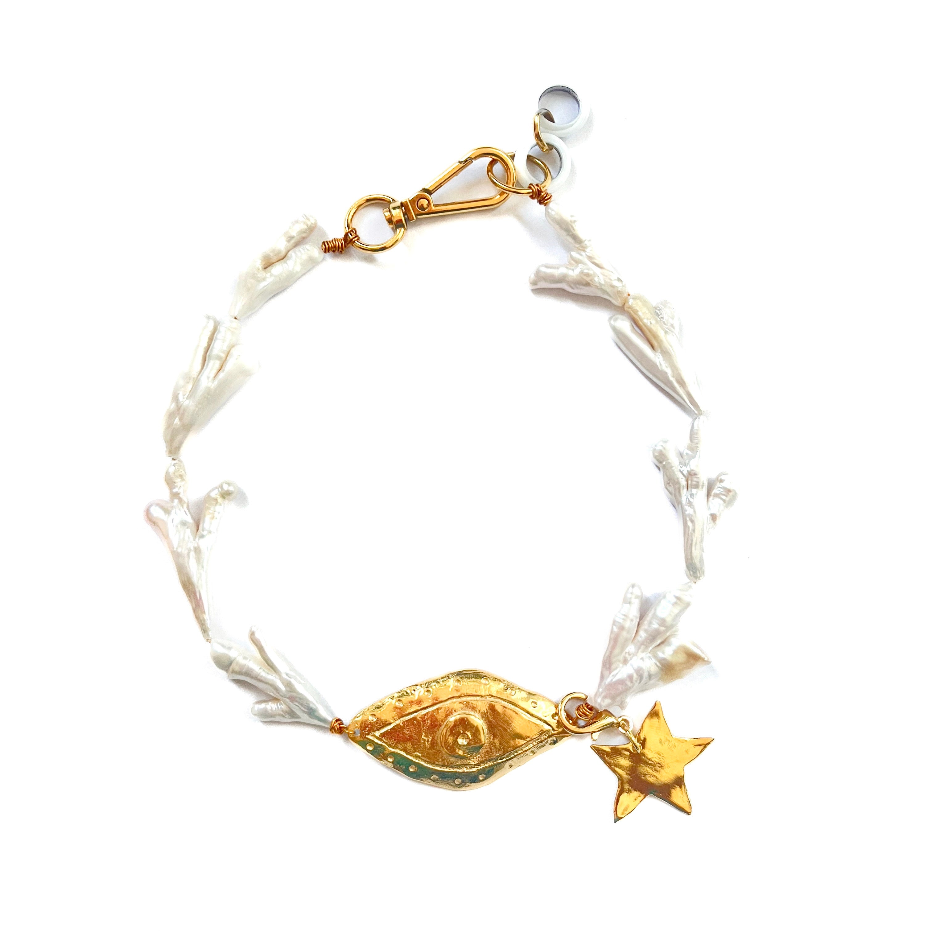 Big Fame necklace is made for those who have big dreams in life and choose to live a magnificent life. Eye and star are gold pleated brass. Beads are hand made glass.