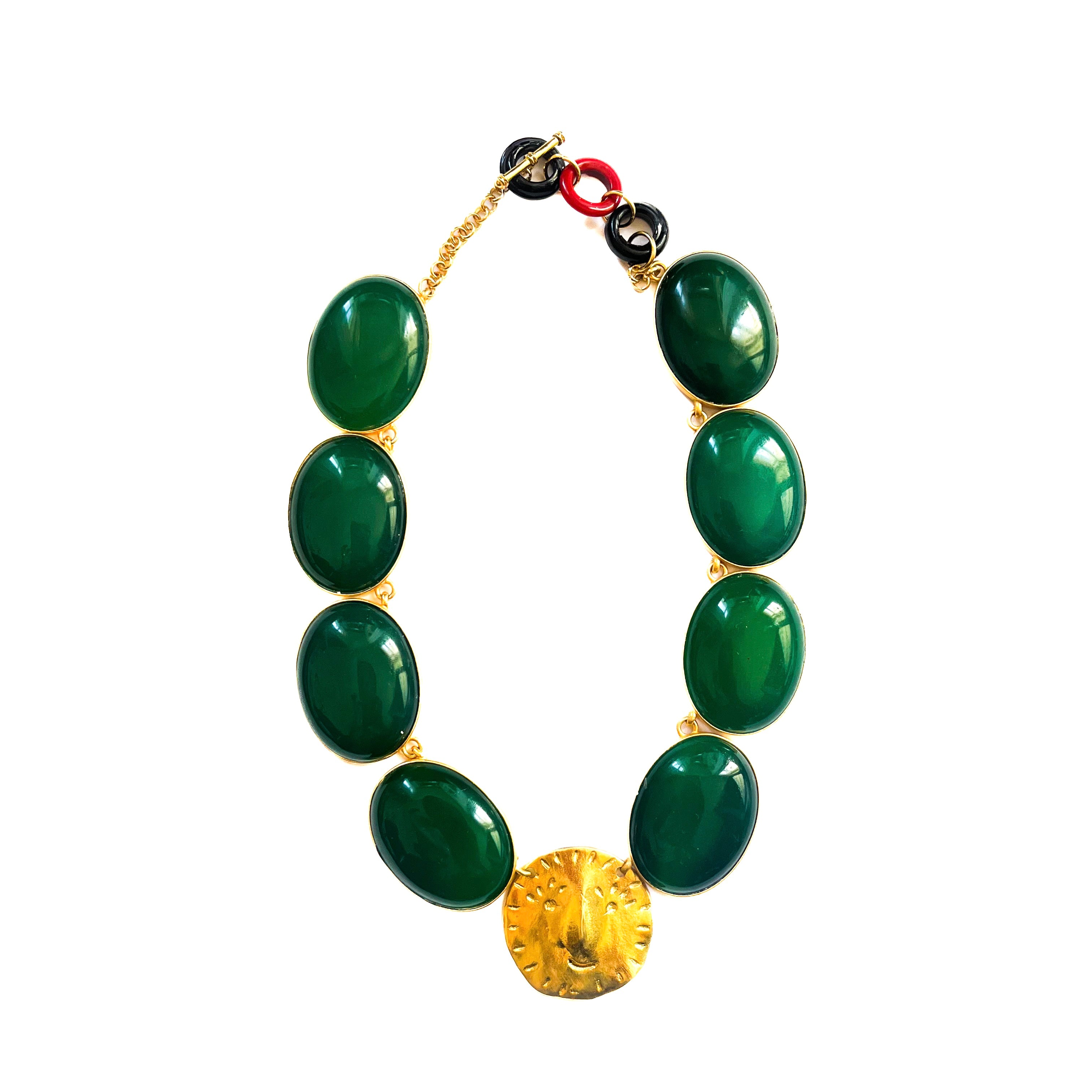 Dude altın kaplama pirinçtir ve yeşil akik taşları ile donatılmıştır. Kolyenin uzunluğu iki farklı kapanış halkası ile 45 cm ve 47 cm olarak ayarlanabilir.